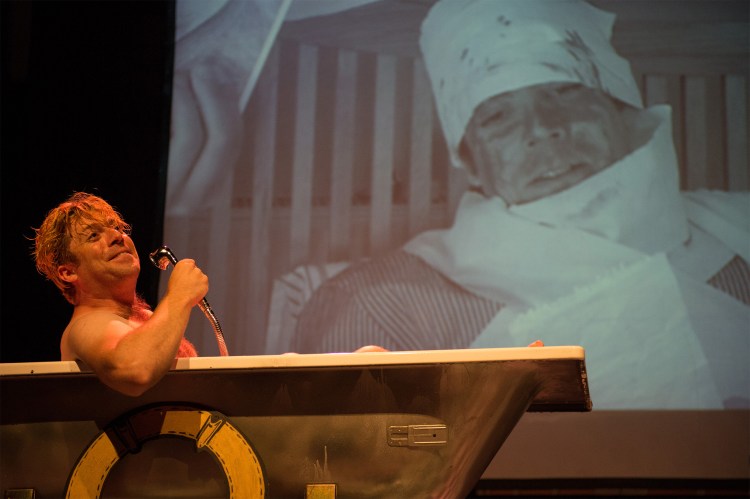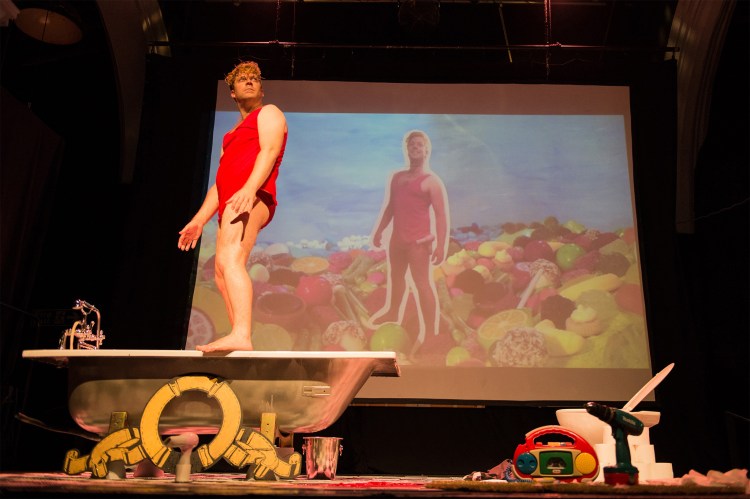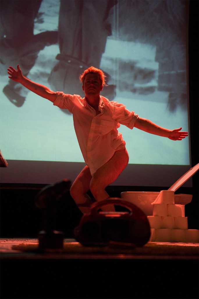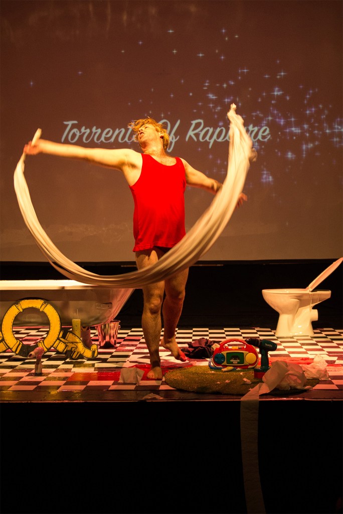 Photos from solo mixed media stage show ‘Torrents of Rapture’ created & performed by Dugald Ferguson with ‘stunt double’ Dan Fox. Finale song original theme by Verity Standen, full score orchestrated by Dan Fox, Cinematography Tim Fox, photography by Paul John Bayfield. The development of this work was supported by Arts Council England, Norwich Arts Centre, Norfolk & Norwich Festival, Norwich Pride, Pleasance Theatre & Fringe Madrid. The stage show was performed in Norwich, London, Brighton, Madrid & Berlin.